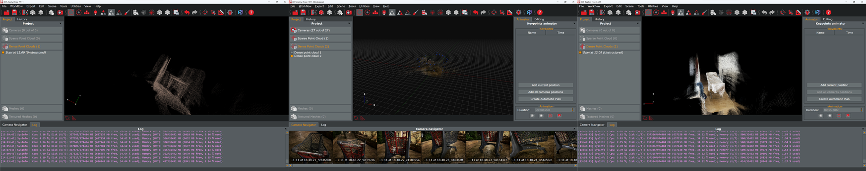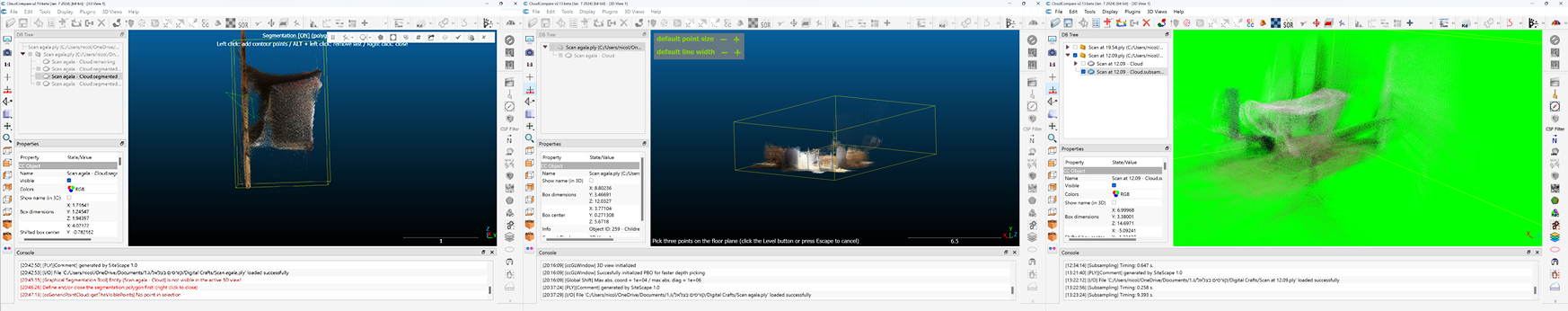 Scanning of a sheet at night --> New scan [SiteScape app] --> Placing scan [3DF Zephyr] --> Cropping Scan, this time using same program [3DF Zephyr] --> Video of scan, same program [3DF Zephyr] --> Editing [Premiere Pro]