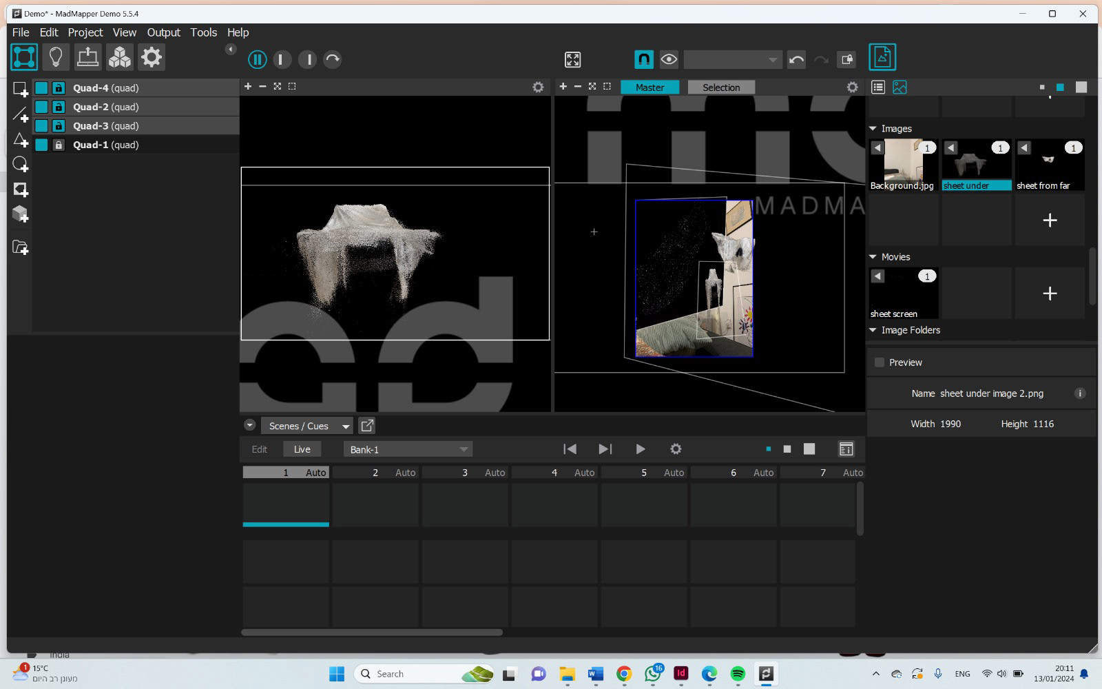 We used Mad Mapper to place our images and videos on the wall and also into a cardboard box. After trying out both options, we decided that we preferred the projection clean from logos and onto a fabric curtain to enhance the flowing effect of the floating white sheet.